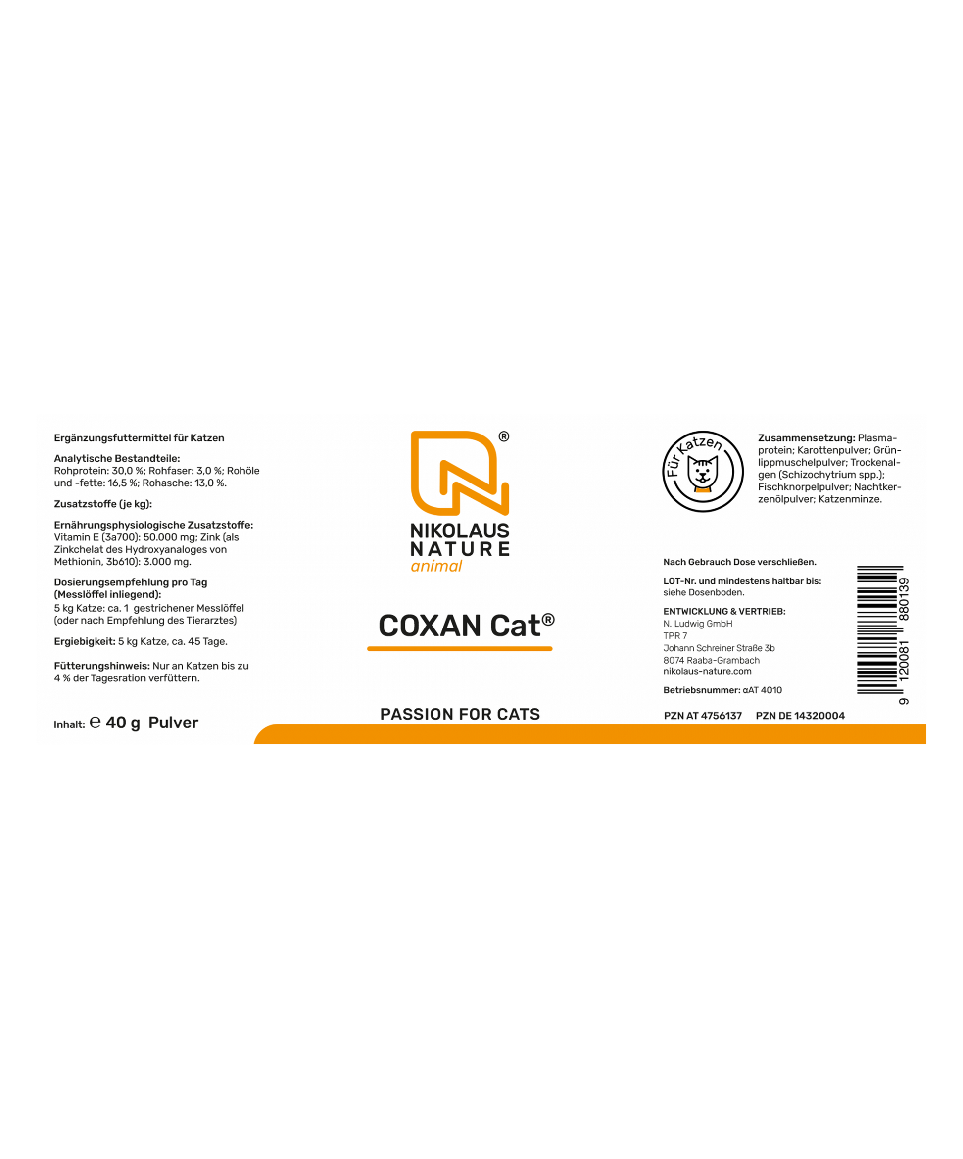 COXAN Cat® supplements daily feeding with targeted micronutrients for nutritional support of the musculoskeletal system, joint metabolism and mobility – ideal for active cats and seniors.