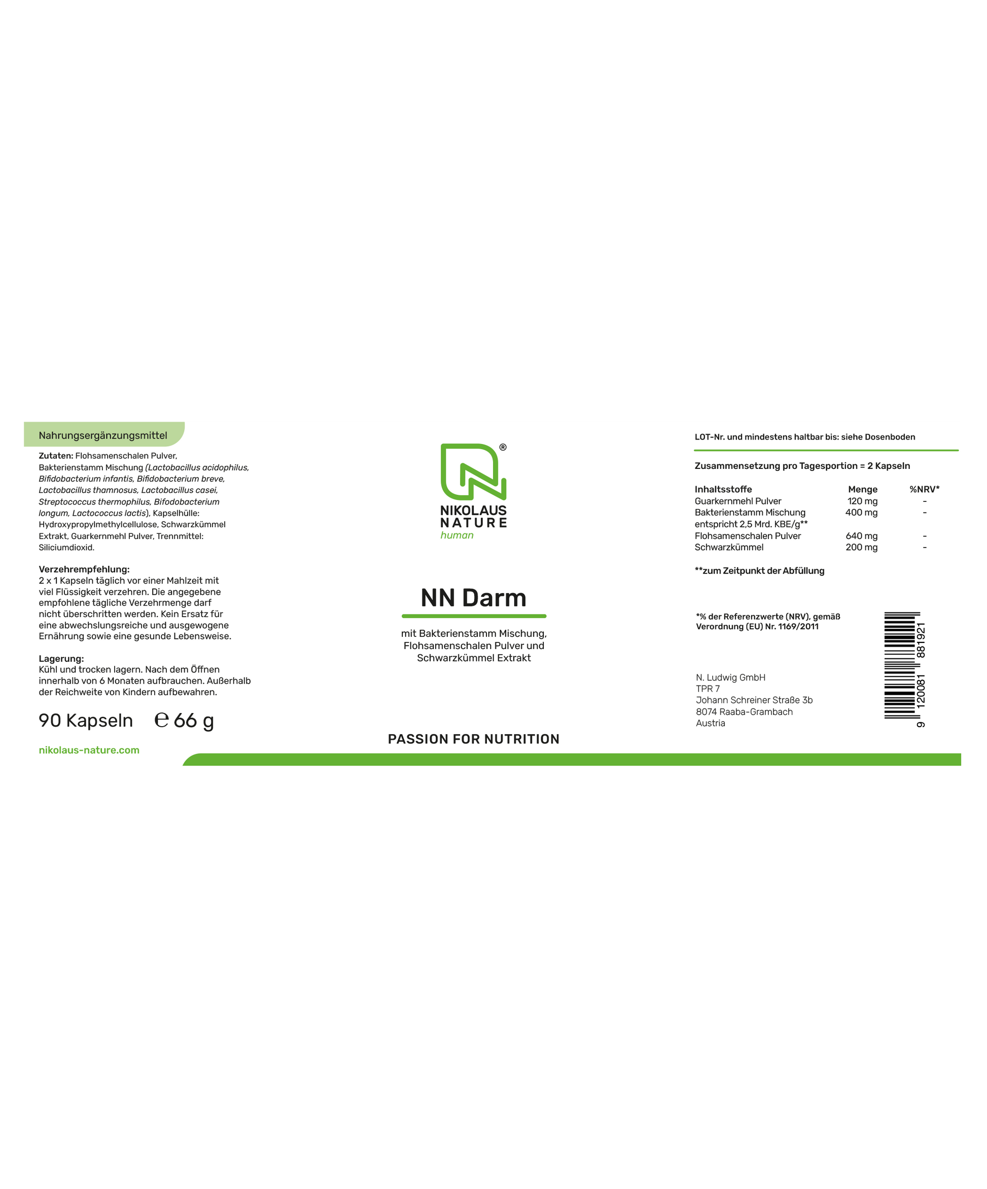 Drink plenty of water—especially if you're supplementing with fiber like psyllium husk. It's best to take NN Darm capsules in the morning and evening before meals. Supplement your intestinal routine with fermented foods like yogurt, kimchi, or sauerkraut to nourish your microbiome daily.