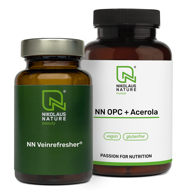 Heavy legs after prolonged standing or sitting are not uncommon – especially in the warmer months. The Vein Vitality Bundle combines two proven products that specifically support your veins and contribute to normal circulatory function. At the same time, they protect your cells from oxidative stress and contribute to a more relaxed everyday life.
