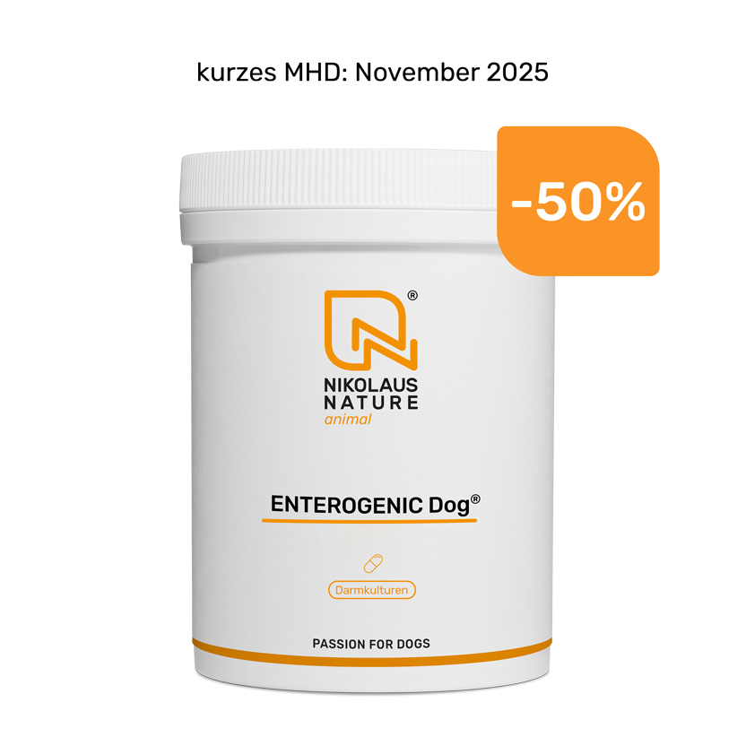 Now at a special price: 50% off ENTEROGENIC Dog® (150 capsules) due to its short expiration date (November 2025). The proven formula with probiotics and prebiotics supports your dog's intestinal flora – ideal for digestive problems or as a daily supplement. Only while supplies last!