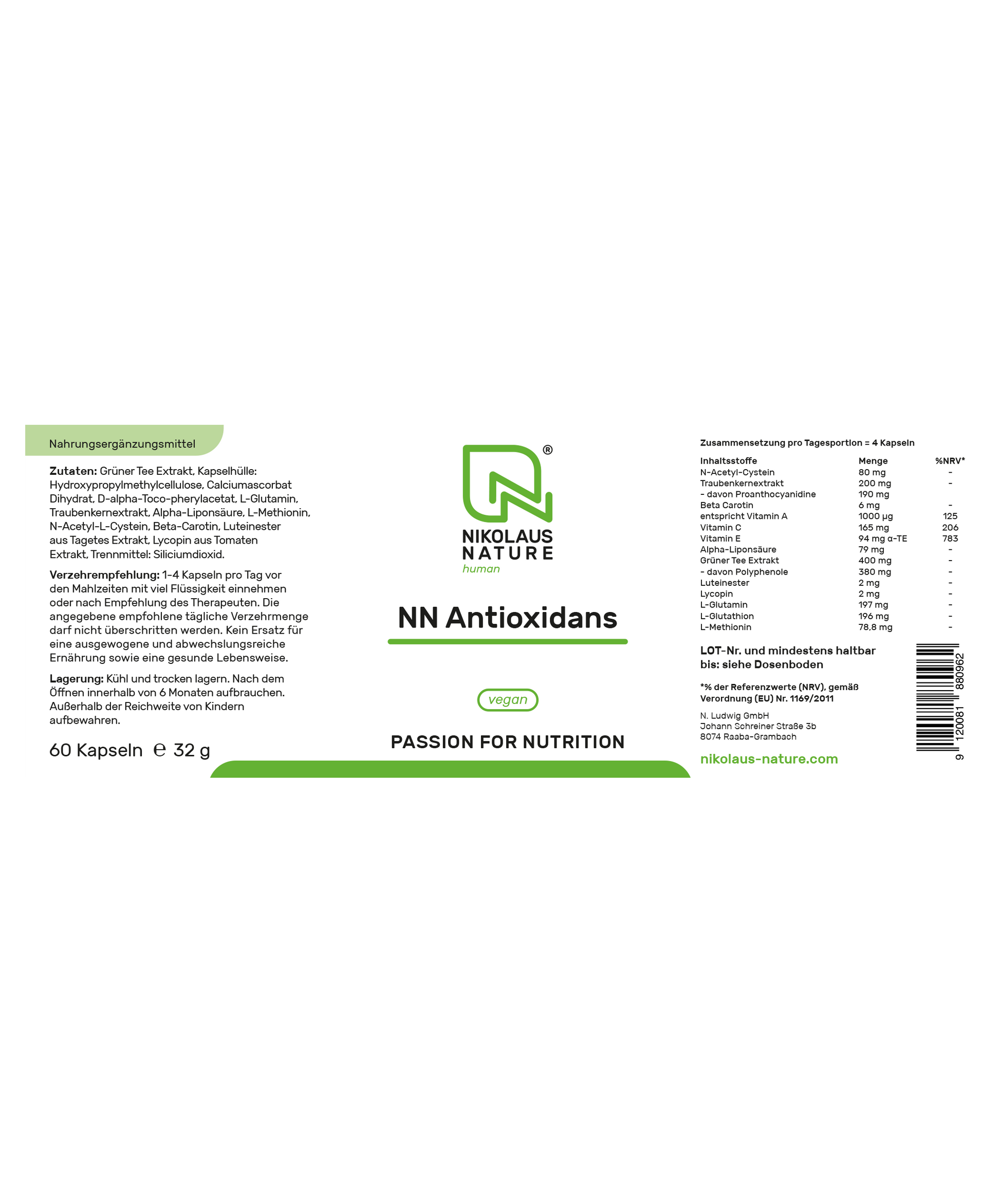 NN Antioxidans provides you with a powerful combination of vitamins, plant extracts, and amino acids – developed to protect your cells from oxidative stress. With vitamins C and E, OPC, glutathione, beta-carotene, and other natural antioxidants to support your body's defenses and for a good feeling from within.