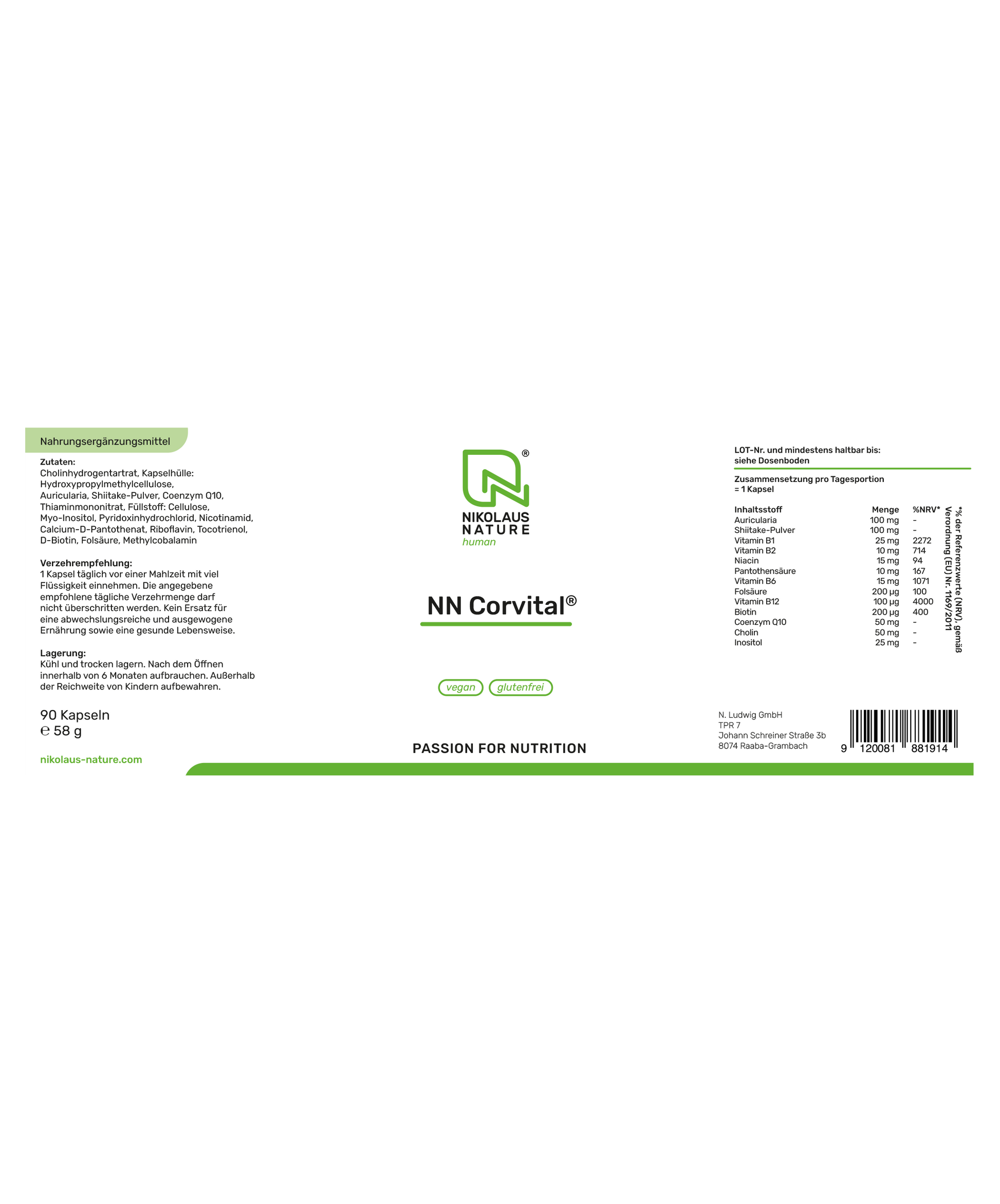 Our heart works tirelessly – day after day. NN Corvital® supports the cardiovascular system with B vitamins, choline, coenzyme Q10, and antioxidant mushroom extracts. For more energy, cell protection, and improved oxygen supply throughout the body – all naturally.